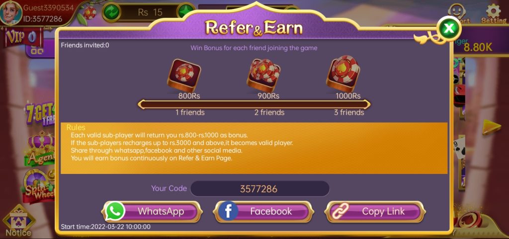 Do daily login invite friends by your referral link and add points to spin the wheel. Spin wheel has three option silver wheel which requires 100 points to spin, gold wheel need 500 points, and 1800 points to spin the diamond wheel. User can avail free spin wheel without any high investment.